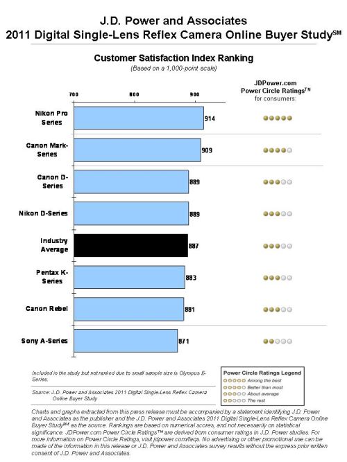 WESTLAKE VILLAGE, Calif.: 19 July 2011 -- Owners of DSLR cameras indicate they are highly satisfied with the picture quality of their cameras, but are notably less satisfied with durability and shutter speed/lag time, according to the J.D. Power and Associates 2011 Digital Single-Lens Reflex Camera Online Buyer StudySM released today.
