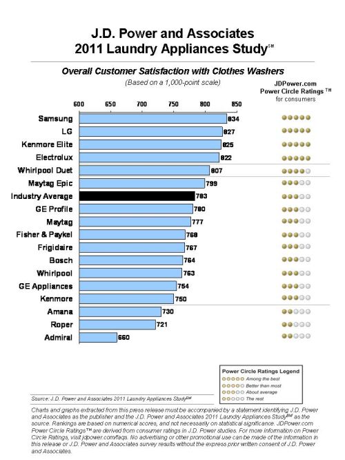 The 2011 Laundry Appliance Satisfaction Study is based on responses from more than 5,600 customers who purchased clothes washers and more than 5,500 customers who purchased clothes dryers during the past 24 months. The study was fielded between March and April 2011.