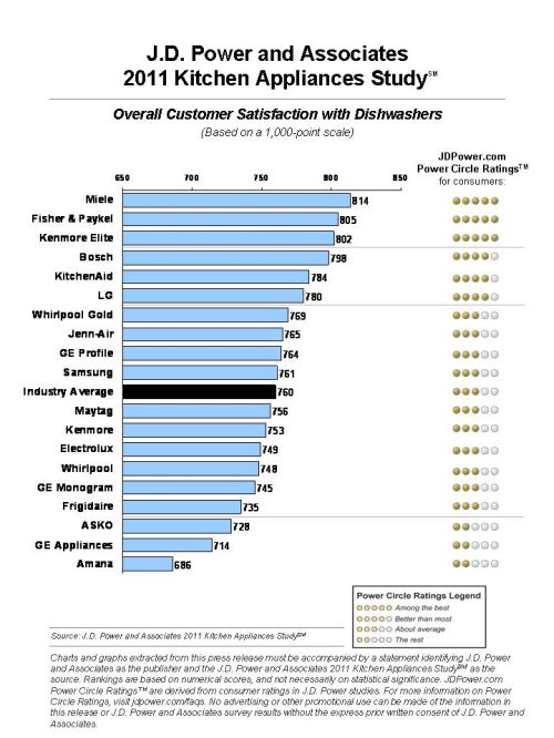The 2011 Kitchen Appliance Satisfaction Study is based on responses from more than 4,000 customers who purchased dishwashers, more than 4,300 customers who purchased cooktops/ranges/ovens and more than 5,000 customers who purchased refrigerators during the previous 24 months. The study was fielded between March and April 2011.