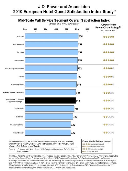 Improving from seventh rank position in 2009, Scandic ranks highest in guest satisfaction in the mid-scale full service segment. Scandic performs particularly well in two measures: check-in/check-out and hotel services. Best Western and Park Inn follow in the segment rankings, in a tie. Best Western performs particularly well in the food and beverage measure, while Park Inn performs well in the cost and fees measure.