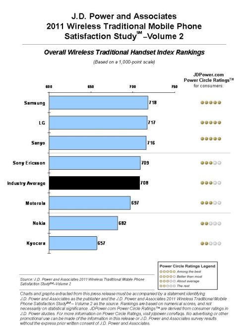 Samsung ranks highest in overall customer satisfaction with traditional handsets with a score of 718. Samsung performs well in three factors: performance, ease of operation and features. LG (717), Sanyo (716) and Sony Ericsson (709) follow Samsung in the traditional handset rankings.